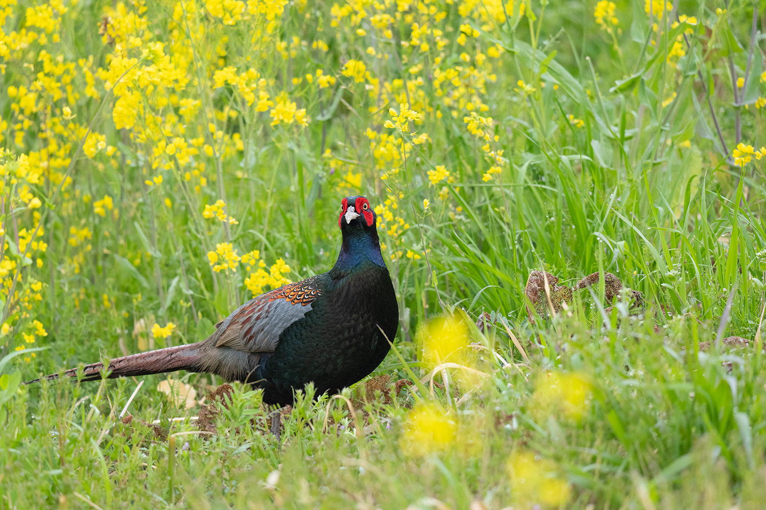 春の河原で出会ったキジ。悠々と歩くその先の土手に菜の花が咲いていたので、先回りして花と一緒に撮れるところに来るのを待って撮影した。