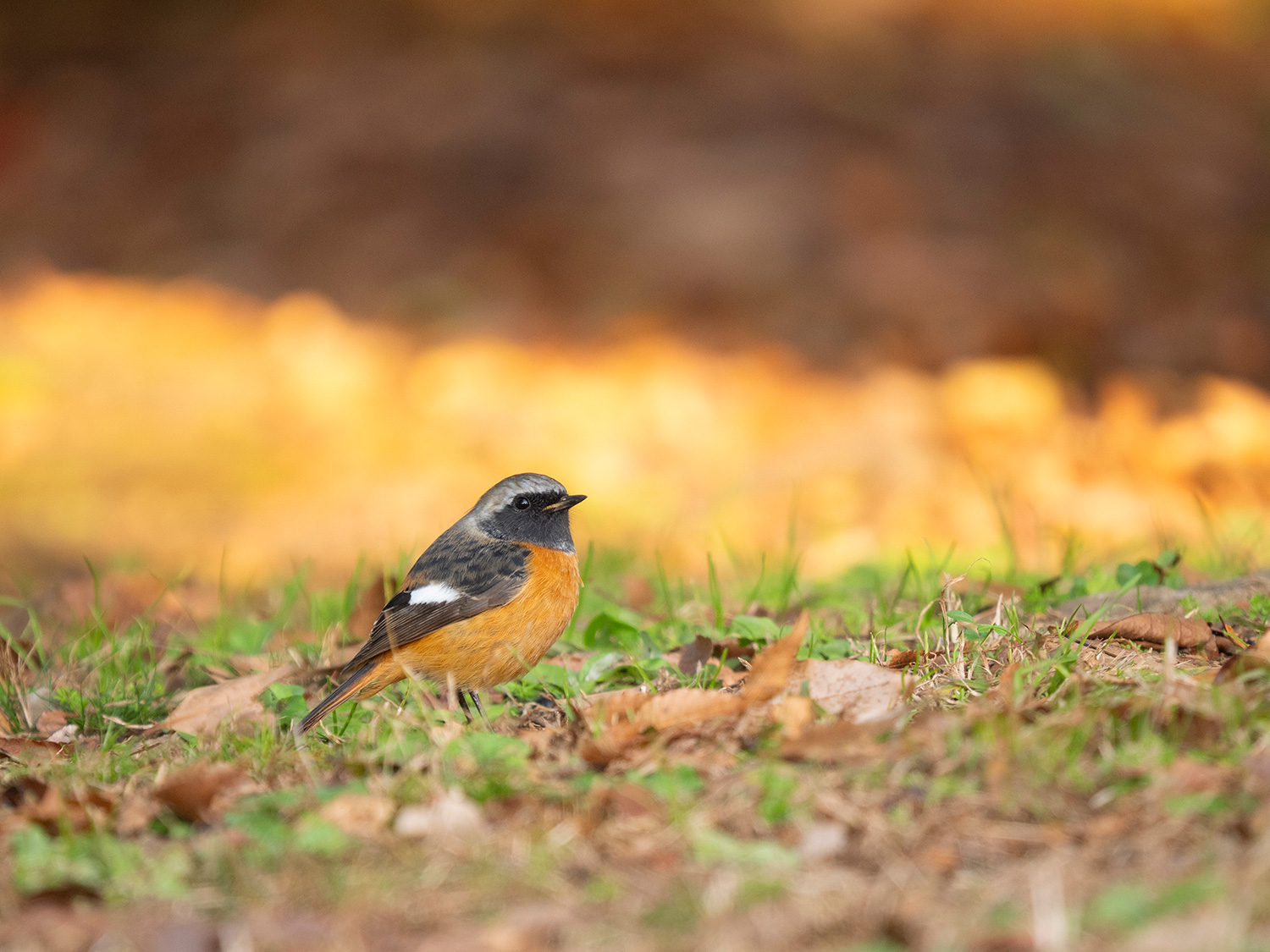 冬の公園ではジョウビタキをよく見かける。地面で食物を探すのに夢中で、たびたび目の前に降りてきたので、低い位置から狙った。