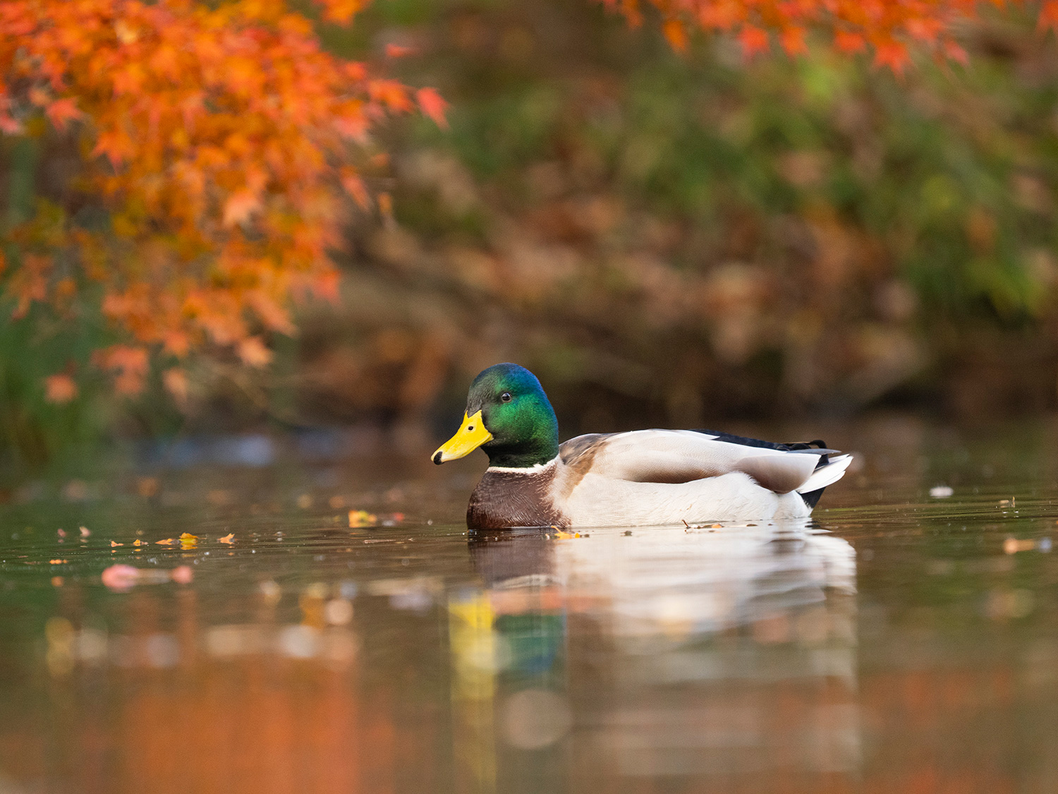 公園の池をのんびり泳ぐマガモ。泳ぐ進行方向に先回りして、背景に色づいた葉が入る位置に来るのを待ち、季節感が出るように撮影した。