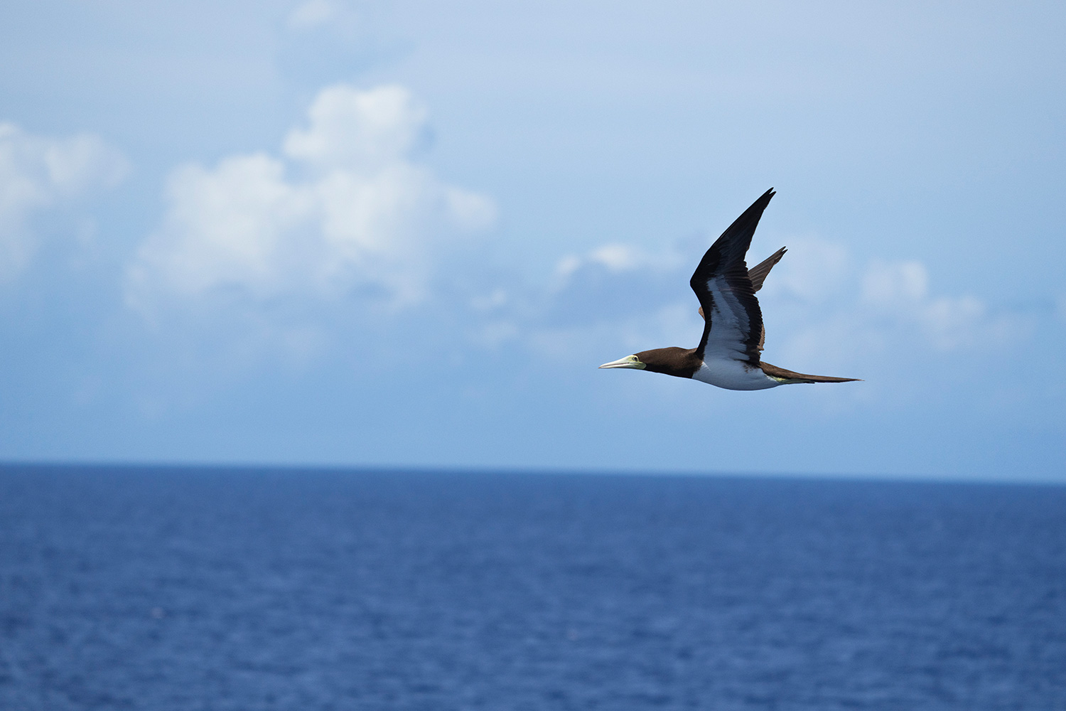 夏空と青い海を背景に気持ちよさそうに飛ぶカツオドリ。船の上からの撮影だが、船に驚く魚を狙って船についてくるので、撮影するチャンスは多い。