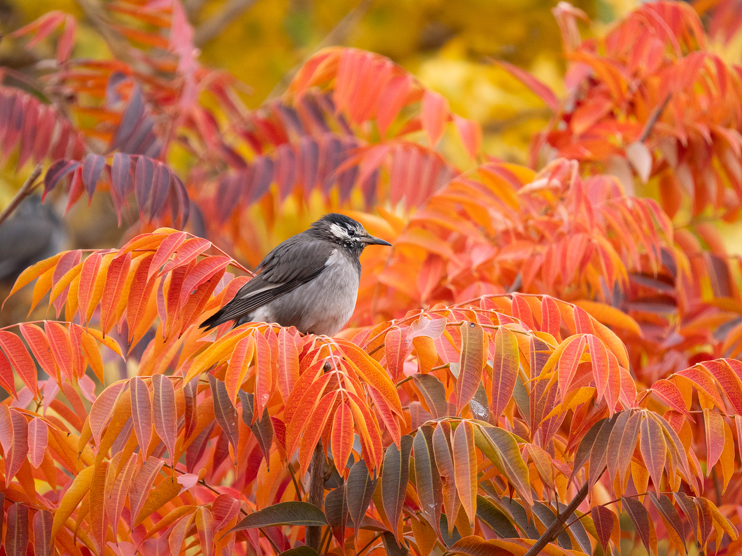 美しく赤く染まったハゼノキにとまったムクドリ。ハゼノキの葉の赤が鮮やかだったので、何か鳥が来ないかと待っているとムクドリの群れがやってきた。