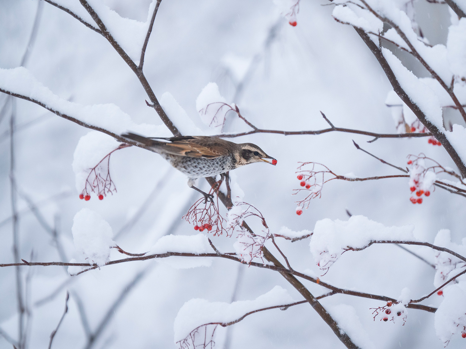 ナナカマドの実を食べにきたツグミ。冬にまだ残っている木の実は鳥たちには貴重な食べ物で、静かに待っていると色々な鳥たちが入れ替わり食べにくる。積もった雪がより冬らしさを強調してくれた。