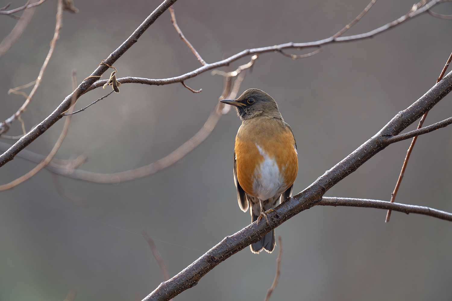 冬の公園で出会ったアカハラ。街中の公園でも緑の多いところでは山で子育てを終え、越冬するためにやってきて、一冬を過ごす。行動範囲もある程度決まっているのでよくとまる木で待って撮影した。