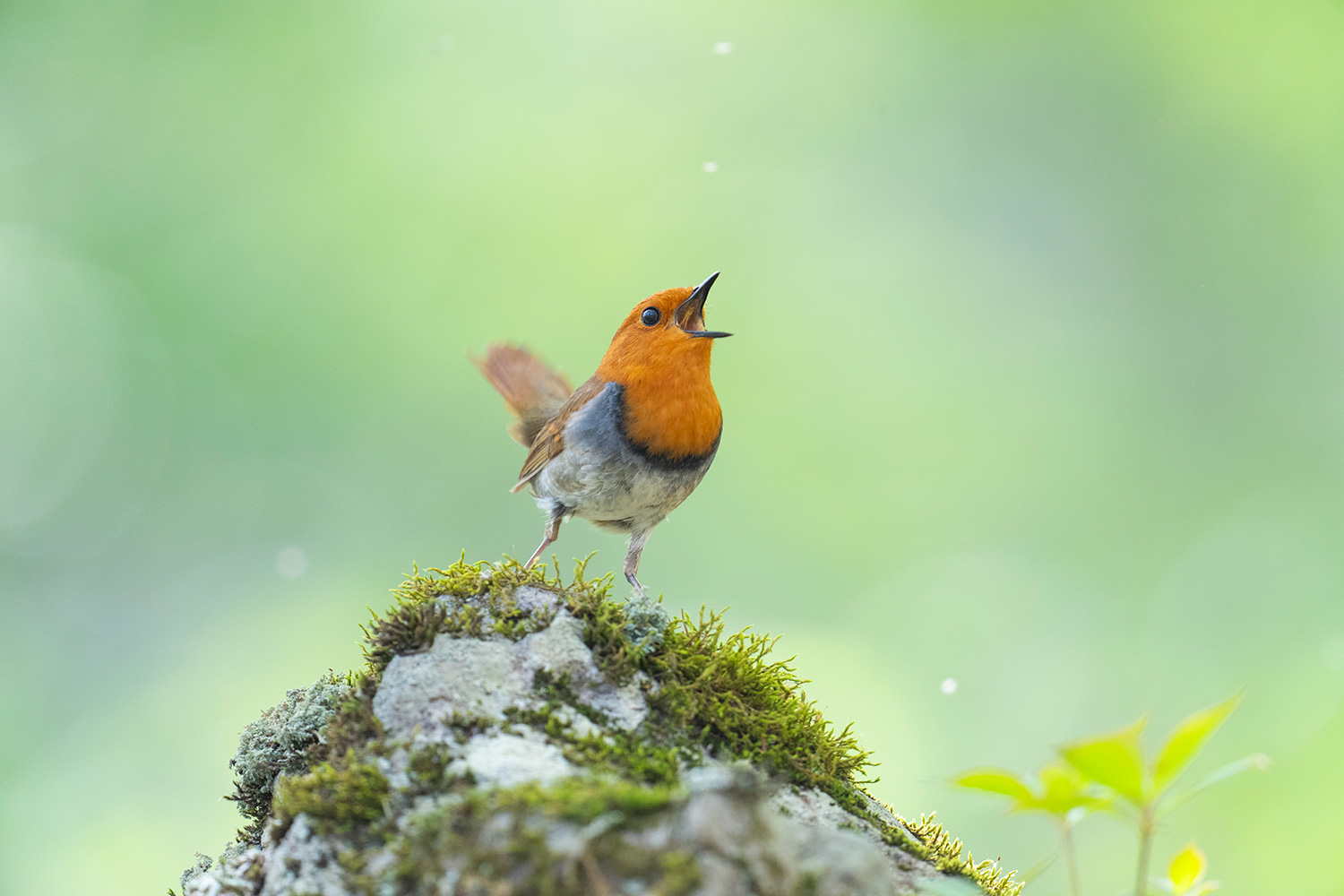 お気に入りのソングポストで囀るコマドリ。繁殖期、コマドリのオスは縄張りの宣言とメスへのアピールの囀りに忙しい。頻繁に囀るポイントを見つけるためには、事前の観察が大事だ。