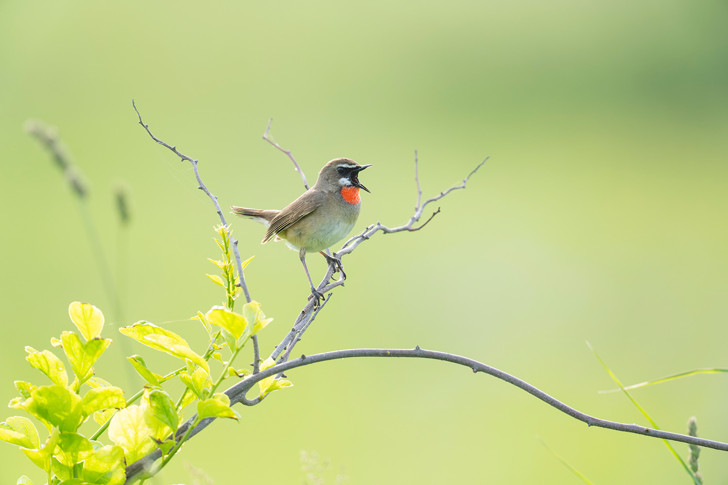 夏の北海道の草原は鳥たちの姿と囀りで賑やかだ。そんな草原でも目立つソングポストで囀るノゴマは喉の赤が一際美しく目立つ存在だ。