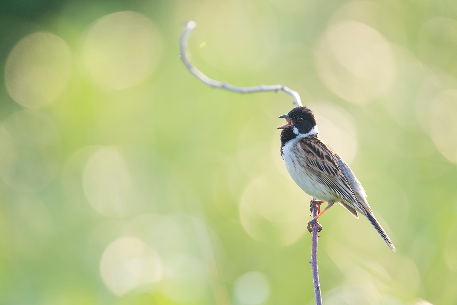 北海道の草原で囀るオオジュリン。草原の鳥たちは目立つ場所で囀り、周辺が見渡せるのでソングポストも見つけやすい。背景がキラキラ光る場所を選んで、静かに待って撮影した一枚。