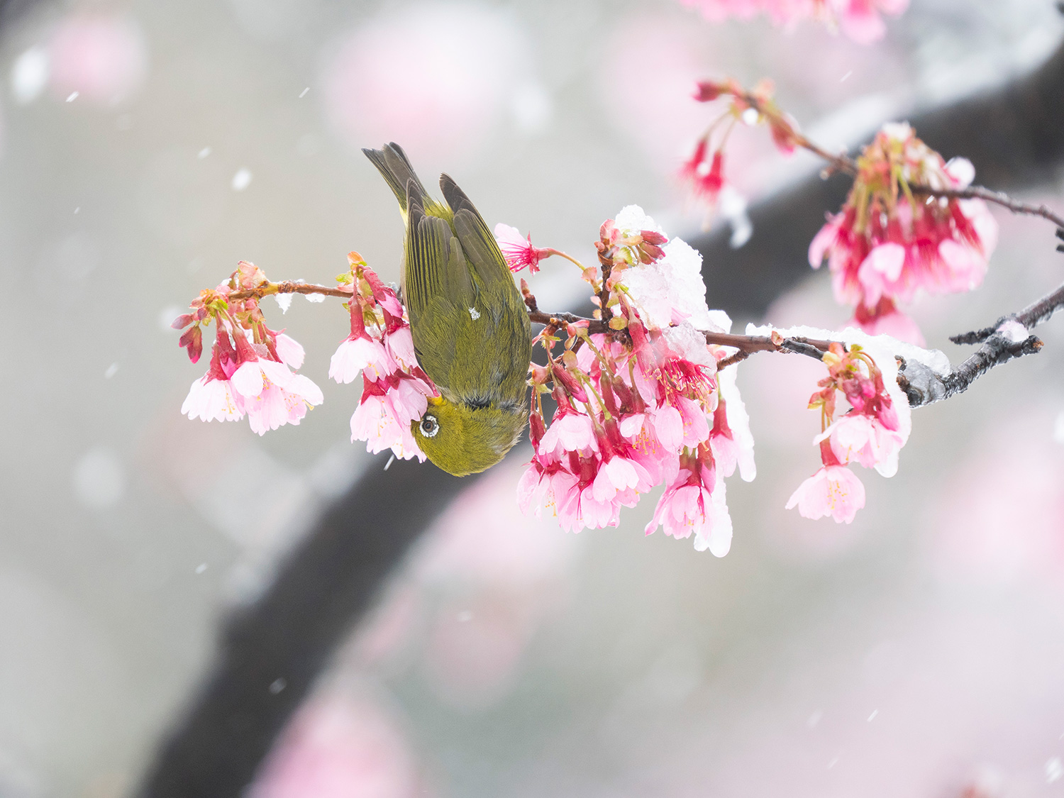 サクラの花は蜜を求めて色々な鳥たちがやって来る。メジロはその代表的な鳥で、花の中に細い嘴を入れ、蜜を吸う。早咲きのサクラなど、咲いている花が少ない時は鳥が集中するので、狙いやすくお勧め。