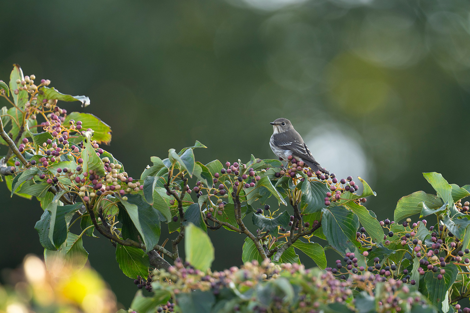 ミズキの実を食べにきたエゾビタキ。鳥を待って撮影するには、鳥の好みの食物のある場所で待つのも有効だ。ミズキの実はヒタキ類など様々な鳥たちが好んで食べる実で、入れ替わり立ち替わり鳥たちが訪れ賑やかだ。