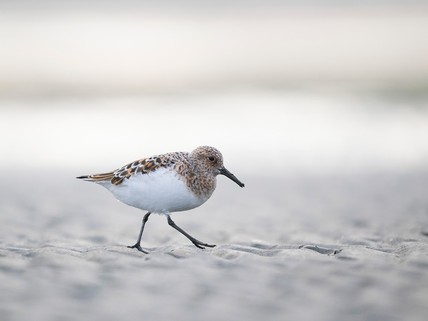 干潟で食物を探しながらちょこちょこと歩くミユビシギ。進行方向を予想して静かにしゃがんで待っていると、目の前までやってきた。カメラを低い位置で狙うことで、背景がすっきりボケて鳥が綺麗に浮かび上がった。