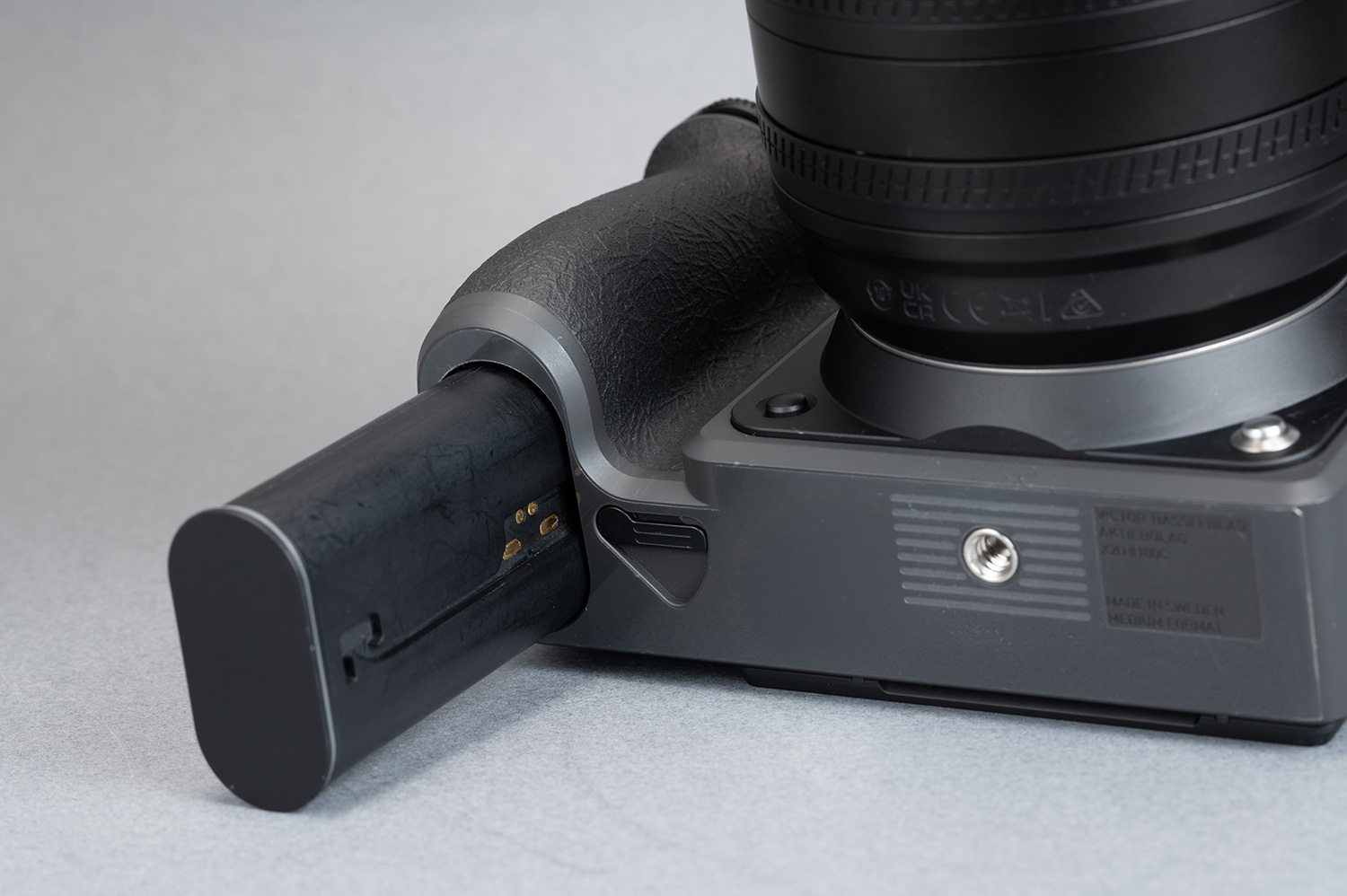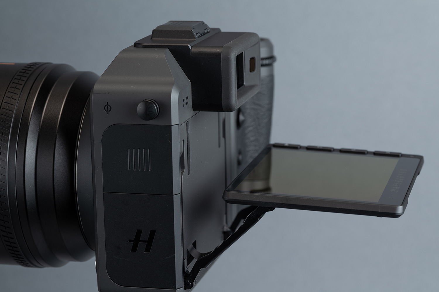 まずは外観とデザインについて。ひと目見て気がつくのはX2D 100Cがブラックカラーだったのに対し、X2D II 100Cはグレーカラーになっていることでしょう。好みは人それぞれですが、Appleでいうところのスペースグレーに近い濃いめのグレーなので、比較的万人受けするカラーだと思います。「カメラのボディカラーはブラック以外は絶対認めない」という人でなければ、問題なく受け入れられるでしょうし、ブラックよりもこちらの方がいいという意見も多そうです。表面はセミマットな質感で高級感も充分感じられます。