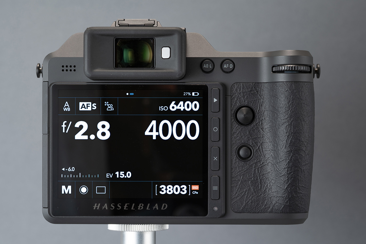 デザインはX2D 100Cとほぼ同じで、中判デジタル機とは思えない薄型形状は健在。ハッセルXシリーズはレンズ側にシャッターがあるため、カメラボディ内にフォーカルプレンシャッター用のスペースが必要ないことが、ボディを薄型にできた最大の要因です。また、X2D 100C以降は動画機能を廃した静止画専用機になっており、動画撮影時に大きな問題となる放熱性に対する対策を過度に行わなくてよいこともボディの薄型化に貢献していると思います。