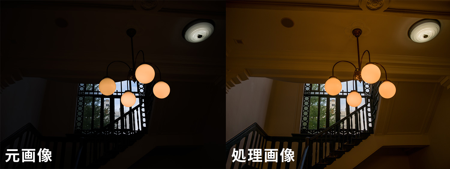 照明部分のオレンジ色の階調を残すため、ハイライト基準の露出で撮影。かなりアンダーになったが、後処理でこれだけシャドー部を持ち上げても階調に破綻がないのは素晴らしい。