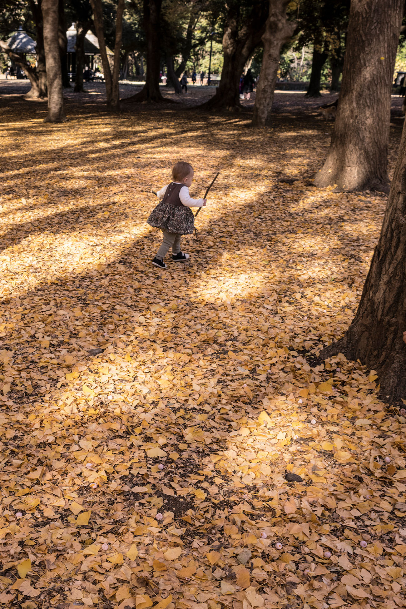 金色の絨毯の代々木公園でのひと時。天使かと思われる愛らしい女の子がぱたぱたと走り回る姿を追いかけずにはいられず、お母様にお声がけして、撮らせていただく。この日は、広角の目でのひとコマ。