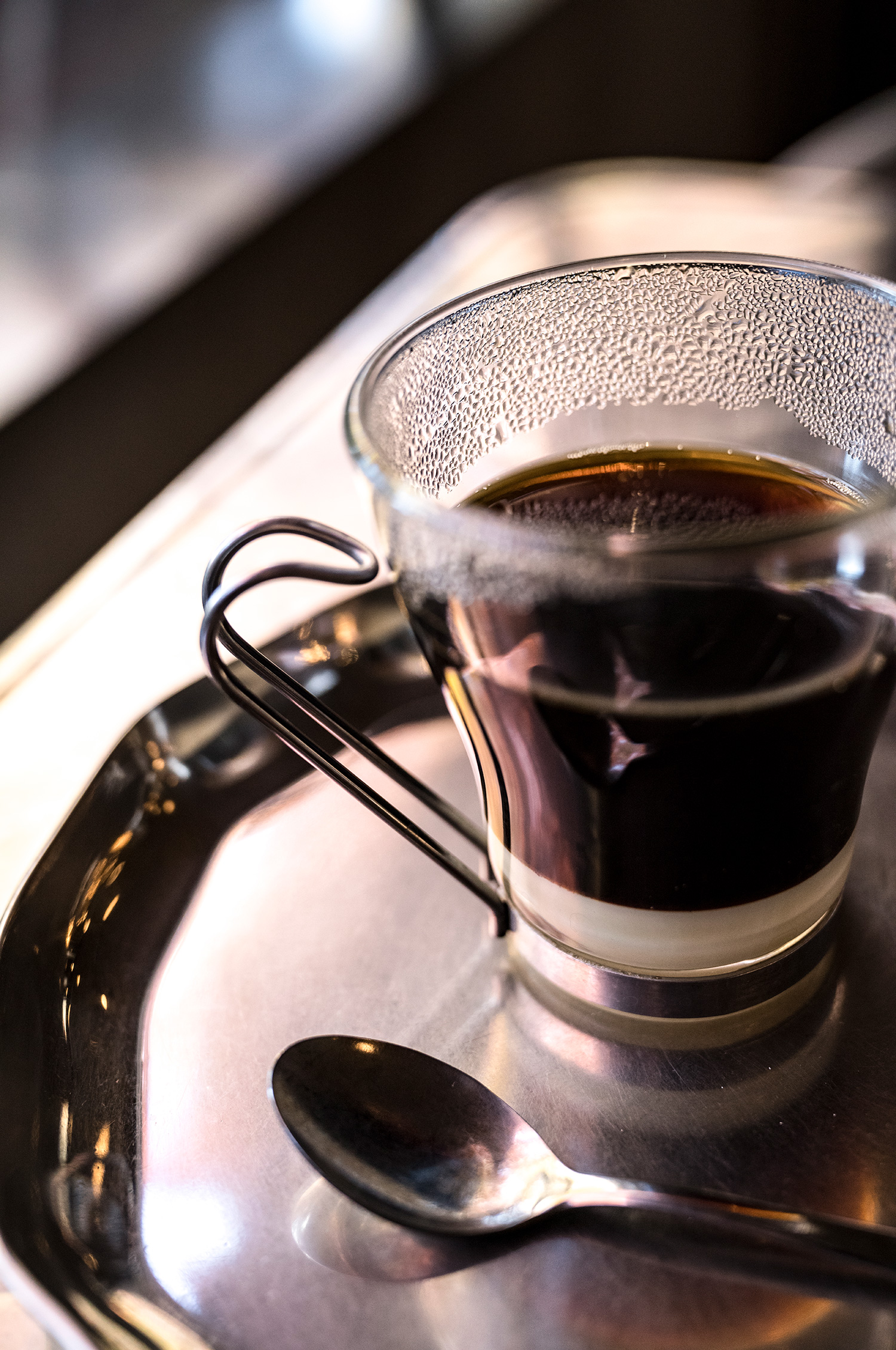 大好きなベトナムコーヒーの湯気で出来た水滴とやんわり、外の紅葉が映り込んだアルミのトレイ。これも秋ならではの景色。