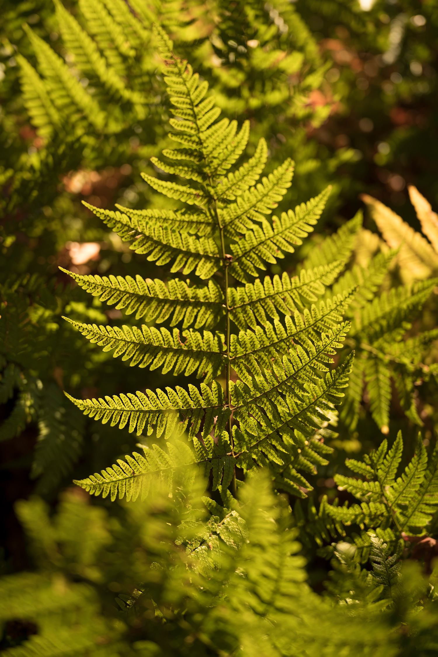 美しい夕日の逆光の中で輝くシダはまるでクリスマスツリーのよう。ぎりぎりまで近寄り、ピント合わせは拡大表示を使いつつ。フレーミングは、ファインダーで覗いたままなので、絵作りがしやすい。