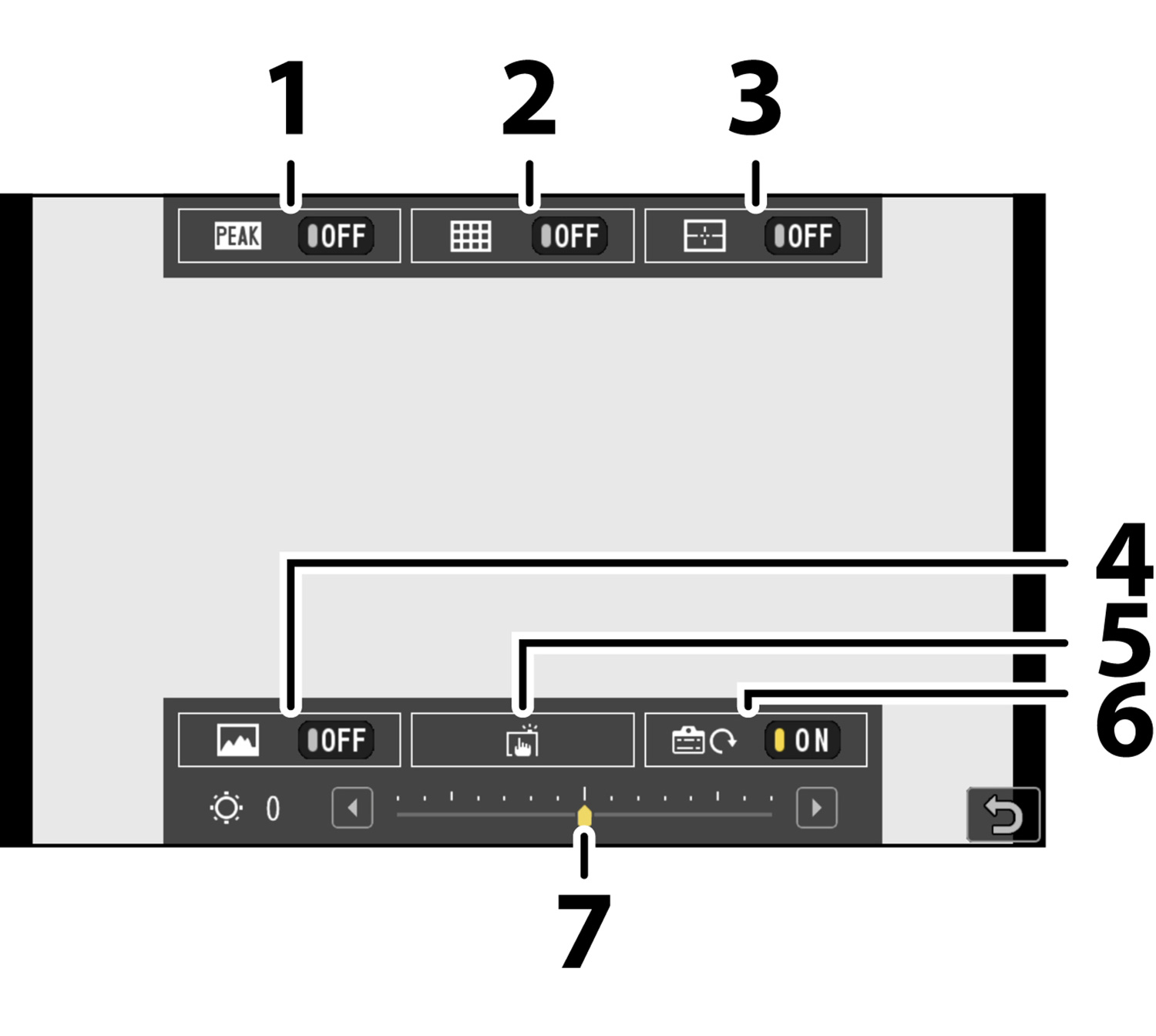 1.フォーカスピーキング表示2.ガイドライン3.水準器4.ヒストグラム5.タッチシャッターの設定6.画面情報の自動回転7.モニターの明るさ