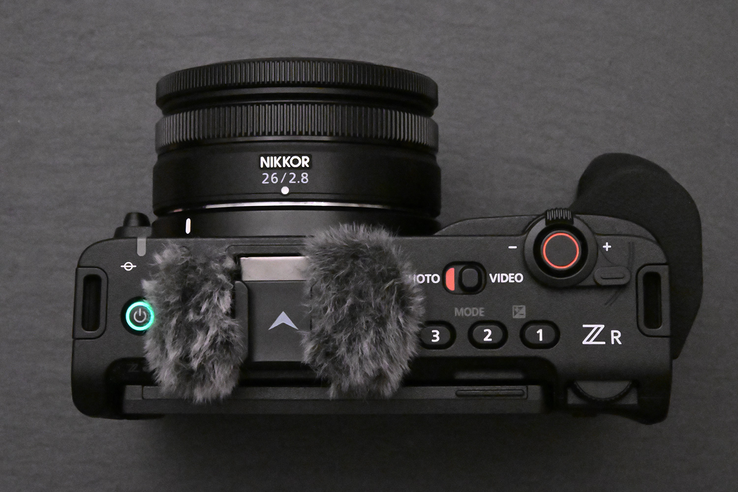 借り物でなくアベの自前のZR。普段使いは携帯性に優れたZ 26mm f/2.8。ホットシューにはND SmallRig ウィンドマフ 3859を装着。音のことを思ってのこともあるが、モフモフの触り心地がよいのも気に入っている。
